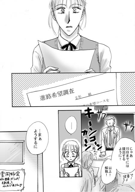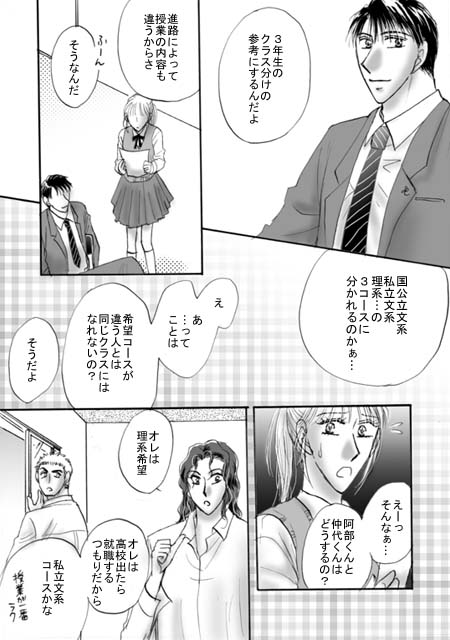 お待たせしました! ACT.12をお届けいたしますv 今回は一話完結、サッパリとお楽しみ下さい(笑) ACT.11ラスト、9月末の体育祭を終え、 ストーリーは10月に突入です 今回は学生らしく あれこれ悩んでいただきます(笑) 学生時代はとっくに過ぎ去った作者、 必死で当時を思い出して 行事をひねってるのですが(笑) 10月というとテストくらいしか 思い浮かびませんね…(^^;) それではACT.12、 どうぞお楽しみくださいませ …今回やけに書き文字が多目ですので、 読み取りづらいところがありましたら お気軽にお尋ねくださいませ〜 (字の大きさには気をつけてますが いかんせん藍川の字は汚いので^^;;;) |