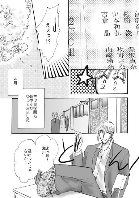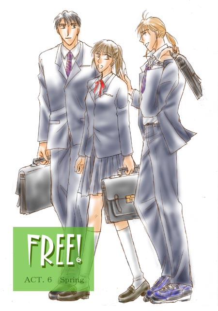 | それでは、ACT.6ですっ! 今回はサクサクっといきましょう、 何事も起きずに(笑)終わりますよ〜(^^;) いちおう今回は新展開への導入編って感じです ずっとほったらかしだった(爆)高校生活に ようやく踏み込みます! そんなワケで、ちょっと退屈かもしれませんが お付き合いくださいませ(*^-^*) トビラは3人揃って全身像、ってことで 色塗る気力も吹き飛びました(核爆^^;) も、すっげ〜手抜きです 範囲指定もせずにじゃかじゃかと塗りました それが味ってことで、カンベンしてください(^^;;;;) 余談 「FREE!」描き忘れナンバーワン(爆)は おそらく制服の三ツ葉マーク (ブレザーの襟にある刺繍ね。校章なのかな) このトビラ絵も描いてないですね〜〜 |